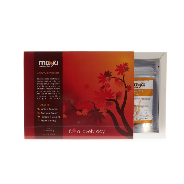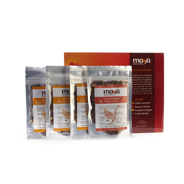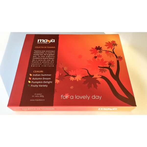 Toamna este anotimpul melancoliei, cu culori in acelas ton, de la galben pal, la rosu argintiu. Invitatie la reverie alaturi de o cana de ceai de fructe si plante din sezonul recoltei. Editie limitata.